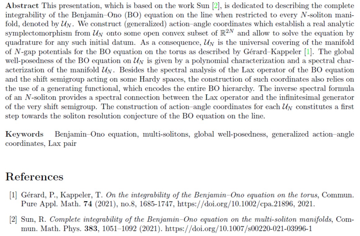 题 目:Complete integrability of the Benjamin-Ono equation on the multi-soliton manifolds