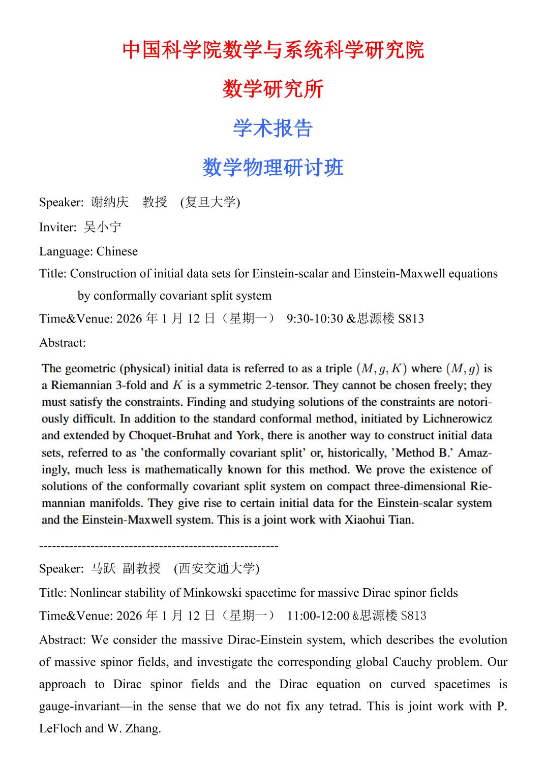 数学物理研讨班:Construction of initial data sets for Einstein-scalar and Einstein-Maxwell equations by conformally covariant split system