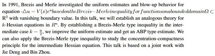 Abstract: The problem of interior Hessian estimates and regularity for the sigma-2 equation is a longstanding open problem. Recently, Shankar and Yuan made a breakthrough on this problem in dimension 4. In this talk, I will briefly review Shankar and Yuan’s result, introduce its generalization, and present related results for the 4-dimensional scalar curvature (sigma-2 curvature) equation. This is based on the joint work with Ravi Shankar.